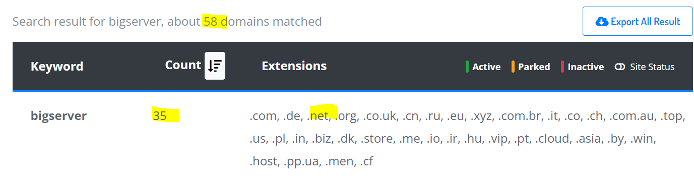 There are 35 domains using "BigServer" as domain name, and 58 domains including "cleanskin" in their domain name.
