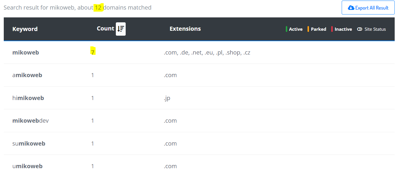 There are 7 domains using "mikoweb" as domain name, and 12 domains including in their domain name.
