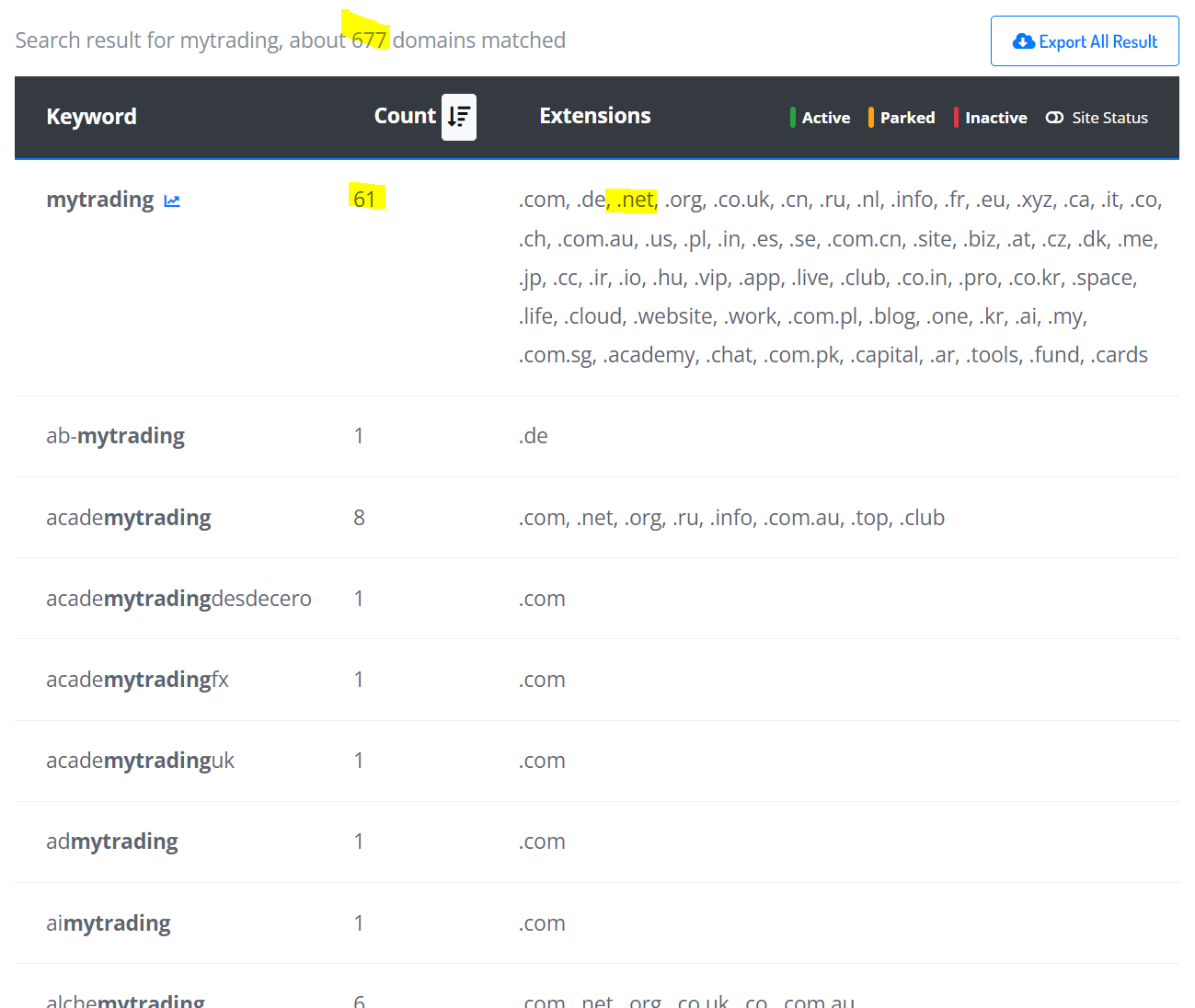 There are 61 domains using "MyTrading" as domain name, and 677 domains including in their domain name.