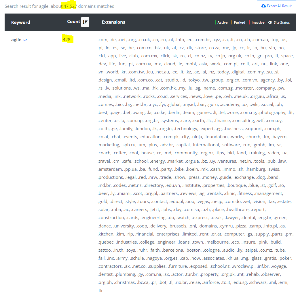 Agile을 도메인 이름으로 사용하는 확장자가 428개에 이르고, Agile이 포함된 도메인은 47,000개가 넘습니다.